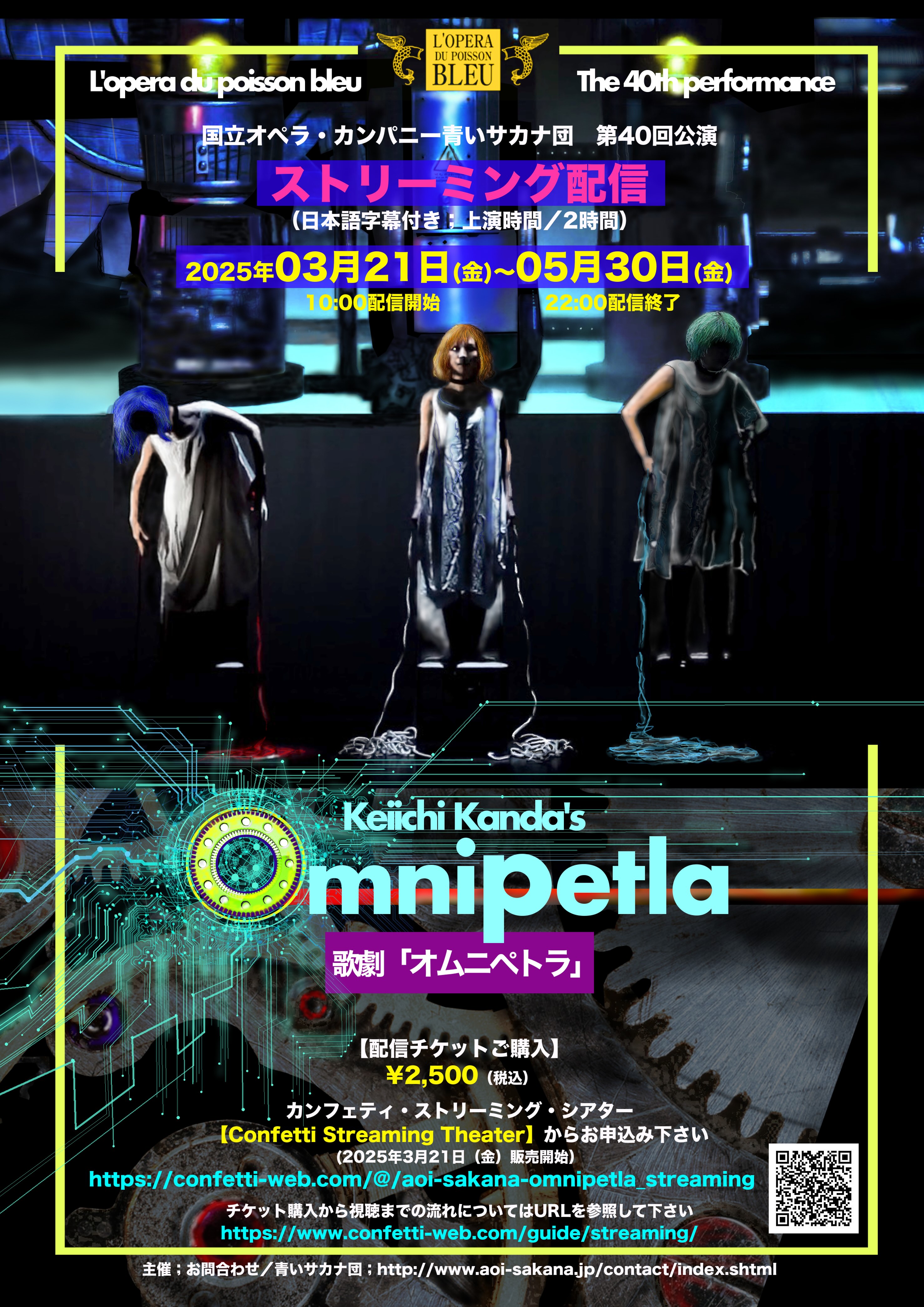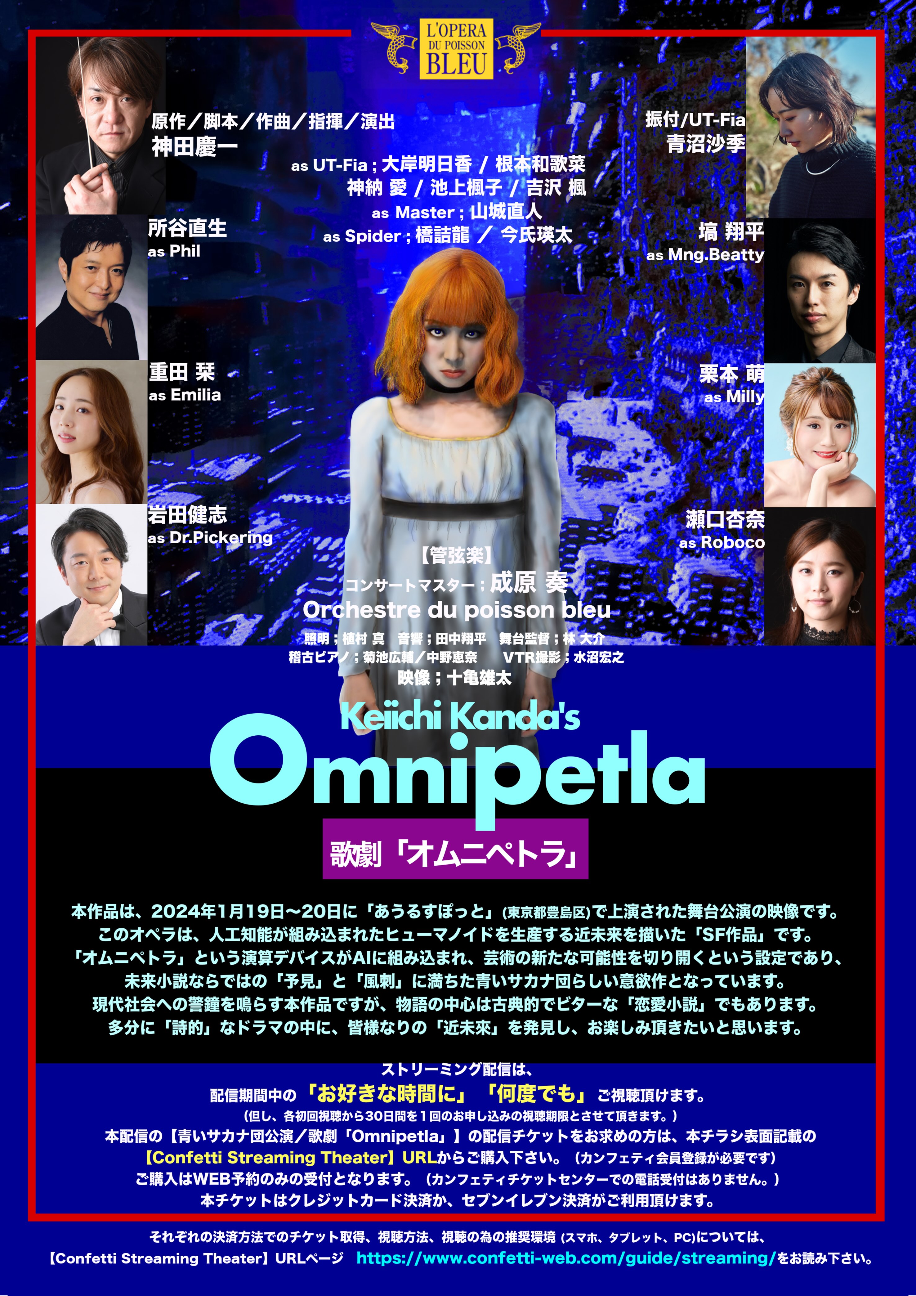 本作品は、2024年1月19日〜20日に「あうるすぽっと」(東京都豊島区)で上演された舞台公演の映像です。このオペラは、人工知能が組み込まれたヒューマノイドを生産する近未来を描いた「SF作品」です。「オムニペトラ」という演算デバイスがAIに組み込まれ、芸術の新たな可能性を切り開くという設定であり、未来小説ならではの「予見」と「風刺」に満ちた青いサカナ団らしい意欲作となっています。現代社会への警鐘を鳴らす本作品ですが、物語の中心は古典的でビターな「恋愛小説」でもあります。多分に「詩的」なドラマの中に、皆様なりの「近未來」を発見し、お楽しみ頂きたいと思います。
